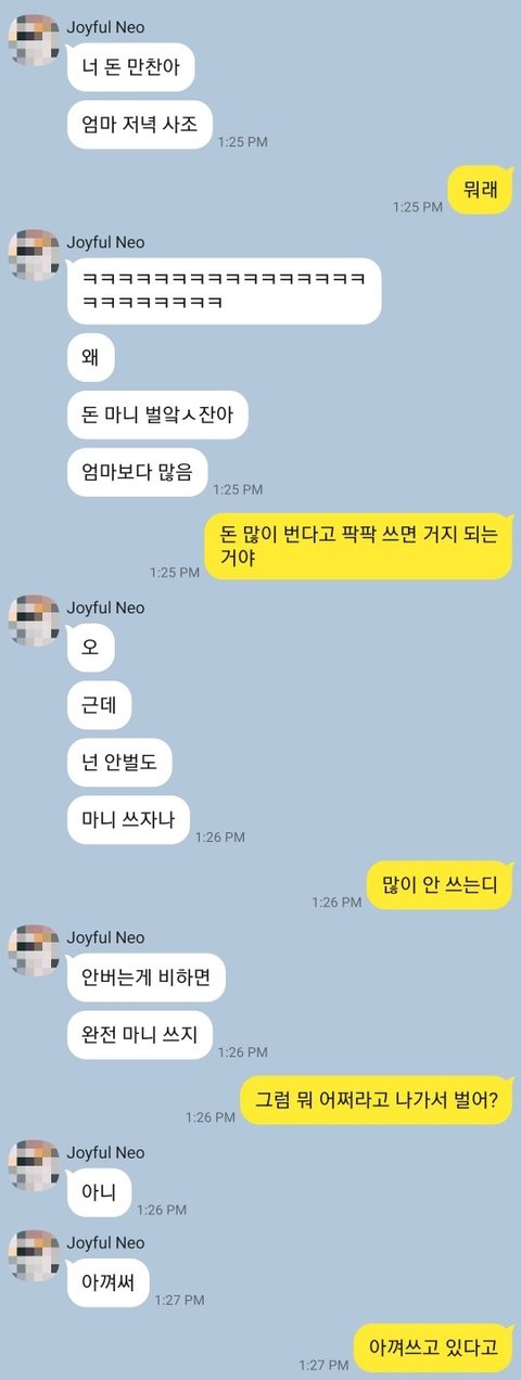 고2이고 설날, 추석, 생일 외엔 아예 용돈 따로 받지 않습니다 저렇게 3번 받는데 한번 받을때 보통 60-70만원정도 받습니다 주변 친구들 보면 2주단위, 한달 단위로 정해서 받는다고 부모님한테 말해보면 그럼 그 친구네 가서 살아 이런 답만 돌아와서 싸우기만 하게 됩니다 요새 물가에 밖에서 밥 사먹고 할 일도 많은데 4-5개월에 60-70이면 충분히 아껴 쓰고 있는거 아닌가요? 6월에 생일이라 얼마전에 친척들, 할머니한테 받은거 모아서 63만원 받았습니다 (부모님은 따로 안 주십니다) 용돈 따로 안 주시는 문제에 대해서는 이제 말해봤자 안 들어주실거 알아서 포기했는데 돈 받았다고 너가 밥 사라 너가 엄마보다 돈 많다 자꾸 이러니까 너무 짜증나고 남들처럼 주기적으로 용돈 안 받는것도 너무 억울해집니다 저 카톡으로 또 싸우기 시작했는데 이게 제가 잘못한건가요?