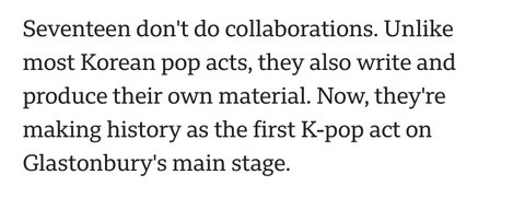 저 기사에 방탄 블핑 스키즈 에스파 머리채 잡아놔서 팬들 ㅈㄴ 욕하던데 이 그룹들은 해외 팝가수랑 콜라보해서 히트곡 뽑았지만 세븐틴은 콜라보를 하지 않는다 이런 식으로 기사가 잘못된 거니까 세븐틴한테 화살은 ㄴㄴ 언급된 그룹들 중 팬인데 타그룹 올려치기에 이용된 게 기분이 나쁠 뿐