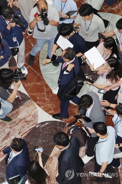 (사진1 설명) (서울=연합뉴스) 김주성 기자 = 국민의힘 추경호 원내대표가 24일 오전 국회에서 7개 상임위원장 자리를 수용하기로 한 의원총회 결과를 설명한 뒤 백팩을 매고 로텐더홀을 떠나고 있다.