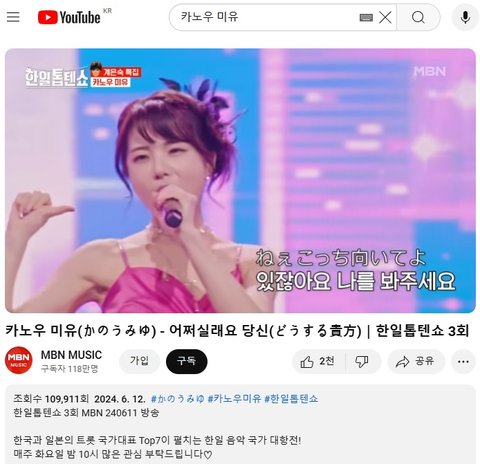 (사진3 설명) 카노우 미유(かのうみゆ) - 어쩌실래요 당신(どうする貴方)|한일톱텐쇼 3회 계은숙 특집 YouTube MBN 동영상 화면 캡춰