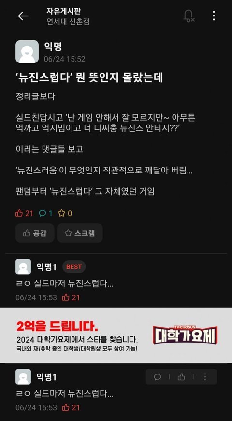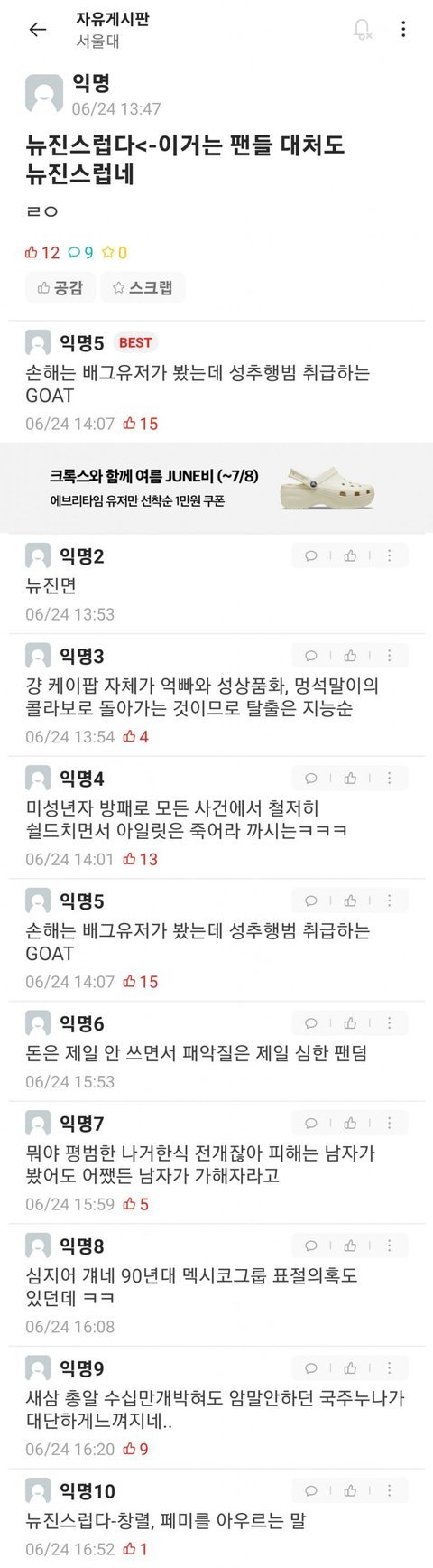 .....? 나 4세대 특정돌 안파고 두루두루 찾아듣는 사람인데 뉴진스가 무슨 국민역적? 티비 트니까 걔네 광고 우루루 나오더라 역적이면 광고 어케 하냐 연대에도 뉴진스 팬 안티 다 있는것을... 저 글 하나로 역적이라고 한다면 너 공부 다시 해야할듯