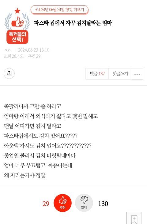 쓰니가 거절해도 엄마가 고집 부려서 외식 나간다고 대놓고 써져 있는 거 보니까 파스타도 쓰니 엄마가 정한 것 같은데 엄마 먹고 싶은 거 먹게 해드려 ㅇㅈㄹ 글도 안 읽나 애초에 양식집 가서 한식 굳이 굳이 찾는 거 보면 어떤 성격일지 뻔한데 이게 대체 왜 쓰니가 나쁜 거임? 결시친 아줌마들이 좌표 찍었나 쓰니 보고 못된 년이라는데 베플 개극혐 다짜고짜 년년 거리는 게 사이다인가봐