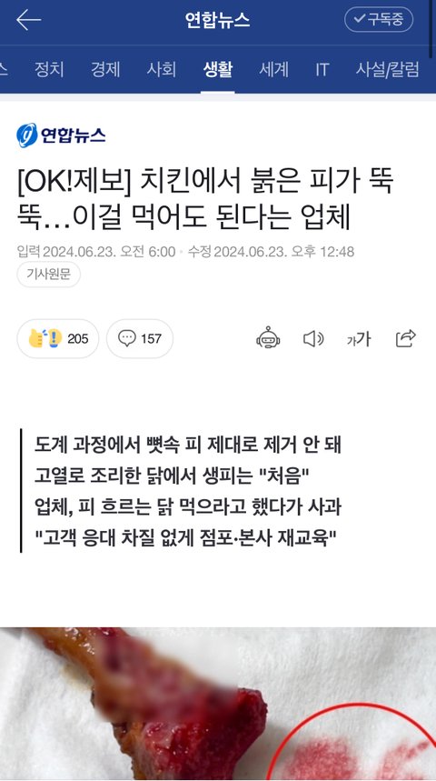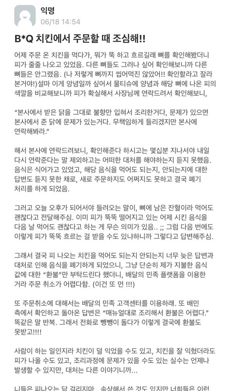 유명 치킨 프렌차이즈 B사 치킨에서 피 뚝뚝