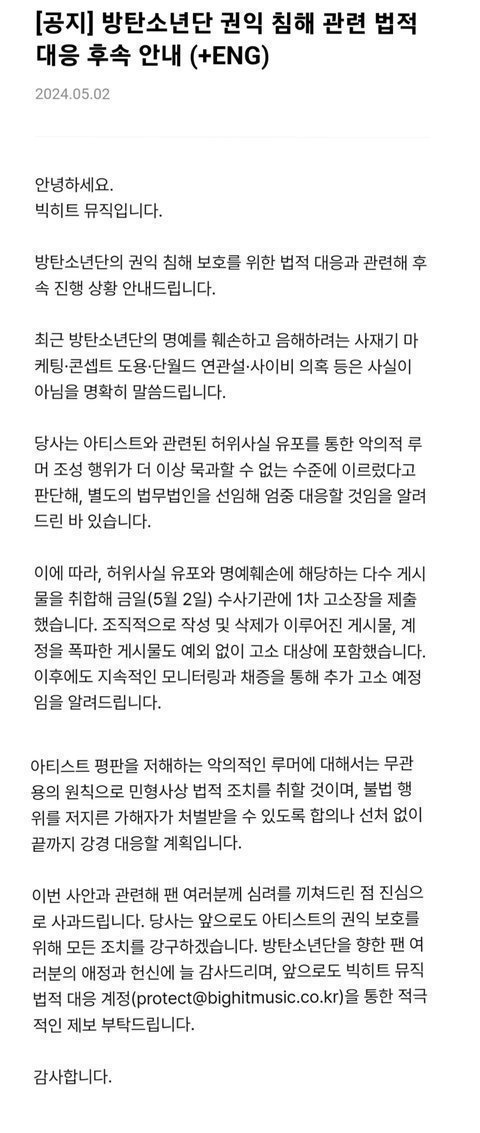 230502 방탄 고소공지 알엠 진 슈가 제이홉 지민 뷔 정국 방탄소년단