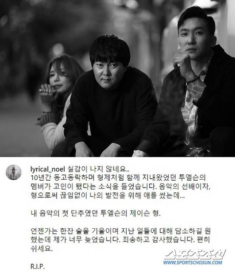 그는 지난 18일 자신의 개인 계정에 투엘슨의 사진과 함께 "실감이 나지 않네요. 10년간 동고동락하며 형제처럼 함께 지내왔던 투엘슨의 멤버가 고인이 됐다는 소식을 들었습니다"라면서 "음악적 선배이자, 형으로써 끊임없이 나의 발전을 위해 애를 썼는데, 내 음악의 첫 단추였던 투엘슨의 제이슨 형. 언젠가는 한잔 술을 기울이며 지난 일들에 대해 담소하길 원했는데 제가 너무 늦었습니다. 죄송하고 감사했습니다. 편히 쉬세요. R.I.P."라는 글을 남기며 고인을 추억했다.