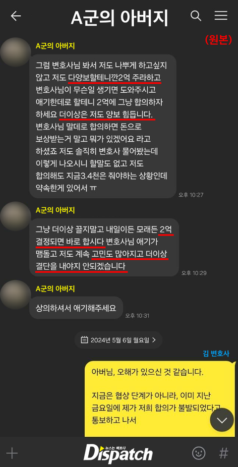 "유튜브 한 번 쳐볼까? 유명 연예인들 사고 치면 합의금 얼마인지? 변호사님도 참. 아시면서 똑같은 얘기를..." (부친)
