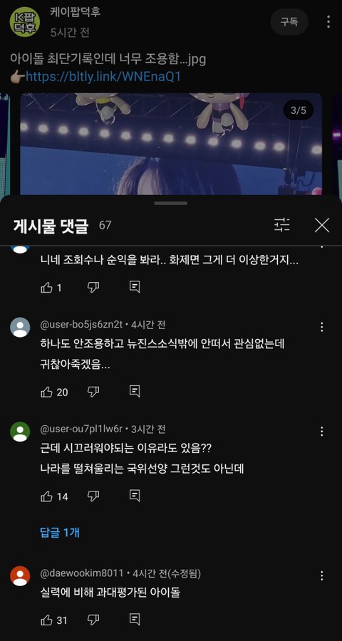 언플도 정도가 있지 뉴진스 언플 너무 과해서 역효과나는거 같은데 작작하면 좋겠음 세븐틴이랑 방탄 까내리면서 뉴진스 찬양하는 언플은 진짜 너무 속보이는데 하이브에서 지능형 안티짓 하는중인거 아니겠지??
