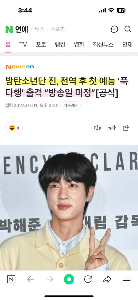 방탄 진 첫번째 예능 ‘푹 쉬면 다행이야’ 예능 출격 공식뜸 방송일은 아직 미정이라고‼️ 촬영은 끝났대..