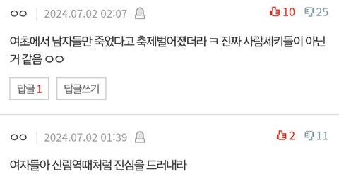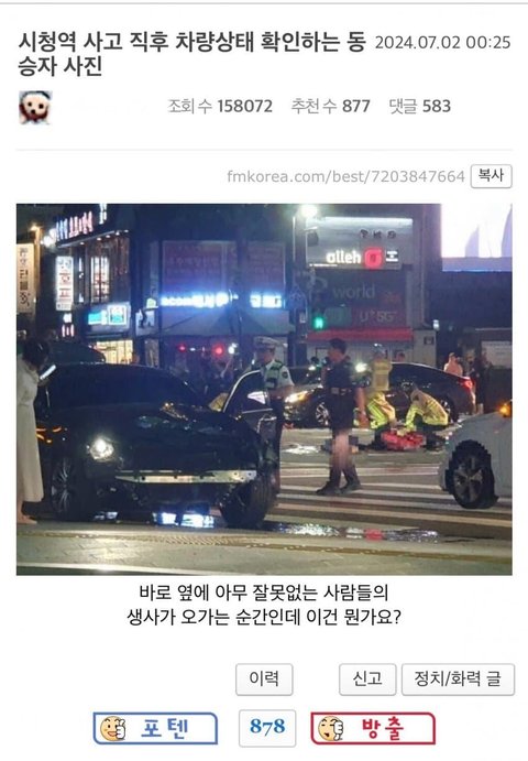 저건 그냥 남/여라서가 아니고 저 동승자의 행동에 문제가 많음. 운전자는 두말할것도 없고 동승자 마저도 사람인가 싶을정도의 행동을 보여주고 있기에 분노한것 뿐이에요. 저 사진만 보면 저도 저여자가 진짜 사람이 맞을까 싶을정도임;; 본인 새하얀 옷 버리기 싫어 피해자 근처도 안가고 차상태 보고 있는거봐요. 본인 앞에 피바다 속 피해자들 죽어가는건 보이지도 않잖아요; 운전자는 걍 말할 필요도 없이 사람으로 안보이고요. 본인이 브레이크 밟아 정지했다면서 왠 급발진? 이래서 진짜 급발진 사례들은 가려지고 피해자만 늘어남;