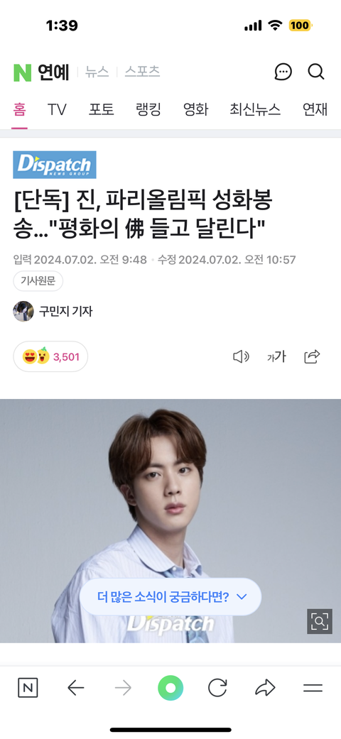 진은 오는 27일(한국시간) 파리에서 열리는 하계 올림픽 성화봉송 주자로 참가한다. 조만간 프랑스 현지로 출국할 계획. 정확한 날짜와 장소는 아직 알려지지 않았지만 곧 출국할 예정이래… 석진이 너무 바쁘네…