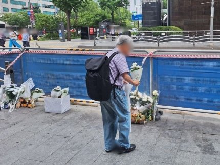 3일 오전 10시쯤 서울 중구 시청역 교차로 교통사고 현장. 배명부씨(77)는 국화꽃 한 다발을 들고 서울 송파구에서 이곳까지 찾았다. 그는 바닥에 놓인 국화꽃을 하나하나 들여다보더니 고개를 숙이고 5초 동안 묵념을 했다.