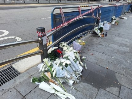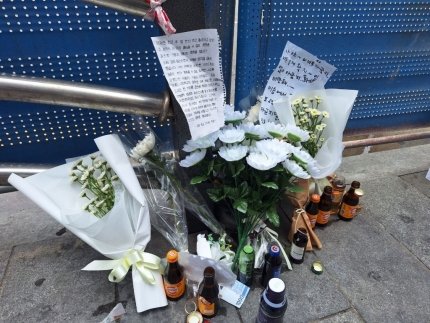 이번 사고로 인도 위에 펜스가 모두 무너지면서 파란색 임시 펜스 9개가 새로 설치됐다. 펜스 곳곳에는 국화꽃 40여다발이 놓여있다. 비타민 음료 박스를 비롯해 뚜껑을 딴 소주병, 커피병, 천원짜리 지폐 등도 있었다.