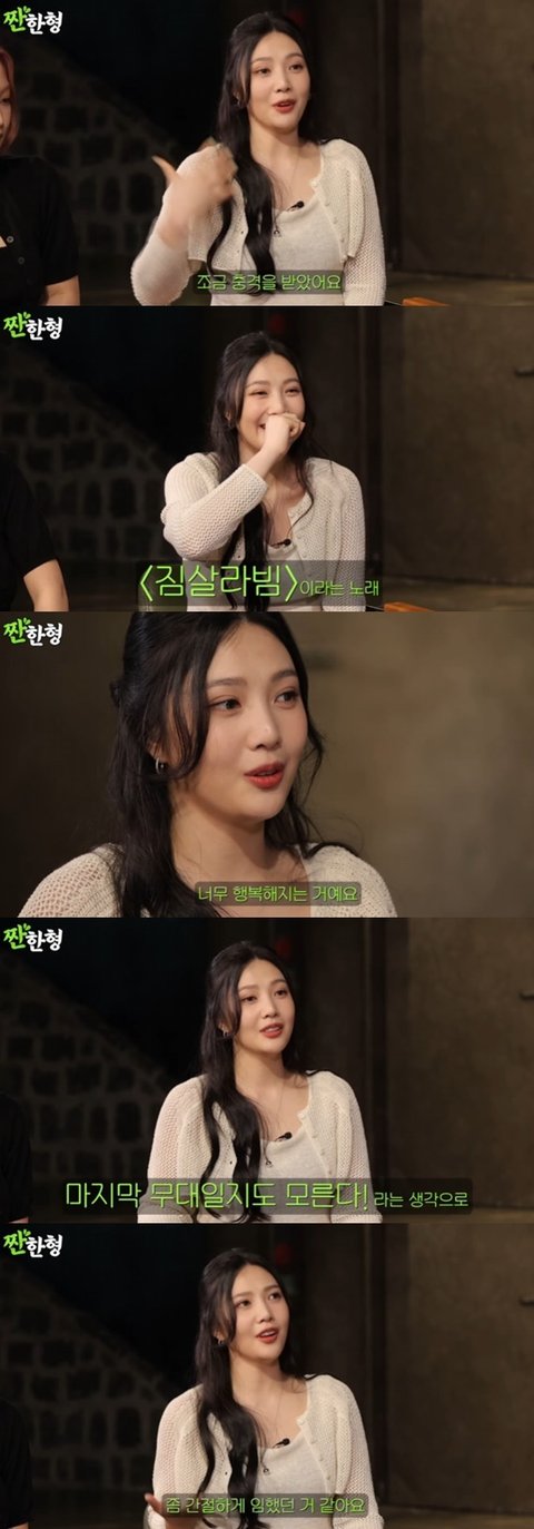 이날 신동엽이 "어떤 노래로 활동할 때가 제일 신났어?"라고 물으며 시선을 모았다. 이에 슬기가 레드벨벳의 대표곡 '빨간 맛'을 꼽았다. 그러나 조이의 선택은 '짐살라빔'(Zimzalabim)이었다. 조이는 "우연히 데뷔 때부터 지금까지 모아놓은 영상을 봤는데, 조금 충격을 받았다, 데뷔 초 저는 너무 방긋방긋 잘 웃고 있는데, 갈수록 제가 너무 지쳐있더라"라고 고백했다.