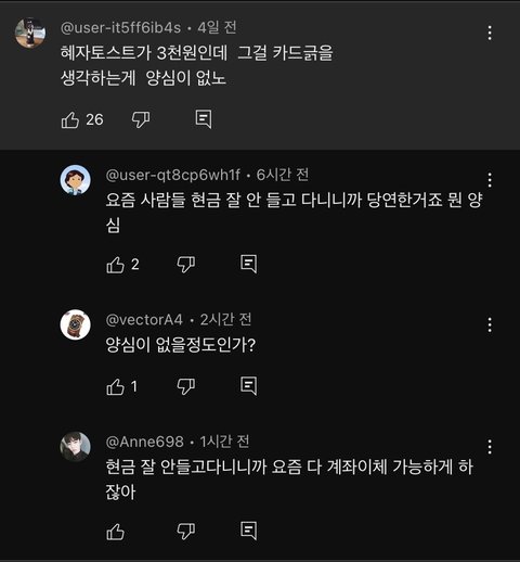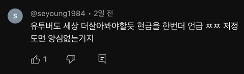 저것보다 더 많음 댓글 너무 어지러워서 화딱지가 남 탈세 신고 걱정 때문에 저렇게 유튜버 악플이나 달고 요즘 한국인 수준 왜이럼?? 진짜 가면 갈수록 정 떨어짐 ㅋㅋ