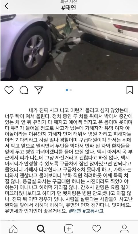 댓글 그만달고 광야에 신고해... 애초에 지금 이글이 날조하는 방향이 무슨 특혜를 입었느니 구급차에 먼저 실렸느니 하는데 실제로는 구급차 실려간적없고 보험도 직접 다 처리했고 사람 다쳐요 라고 했던 이유가 매니저가 밀려서 다칠뻔해서 했던 말임.. 댓글 그만 좀 달어