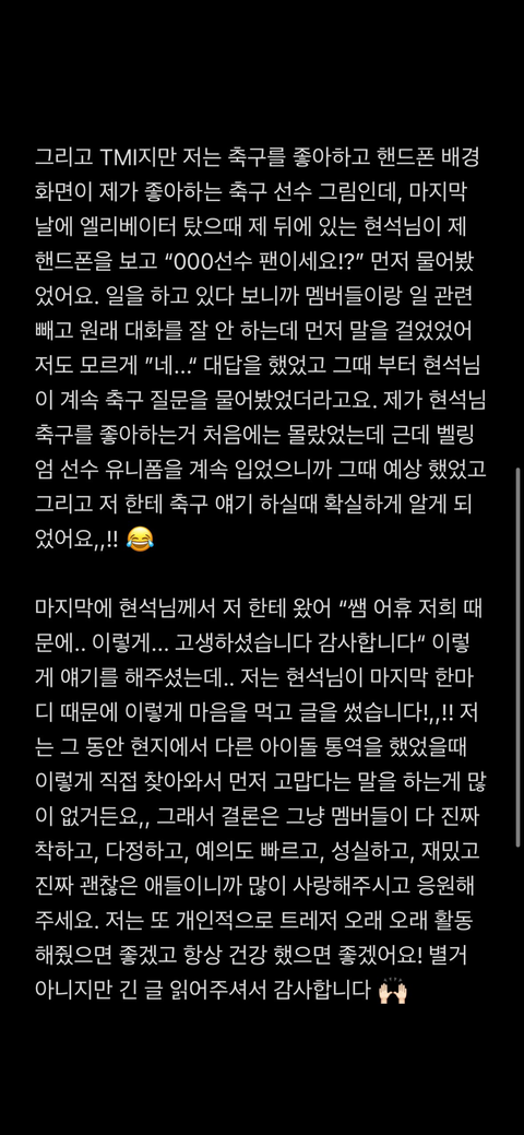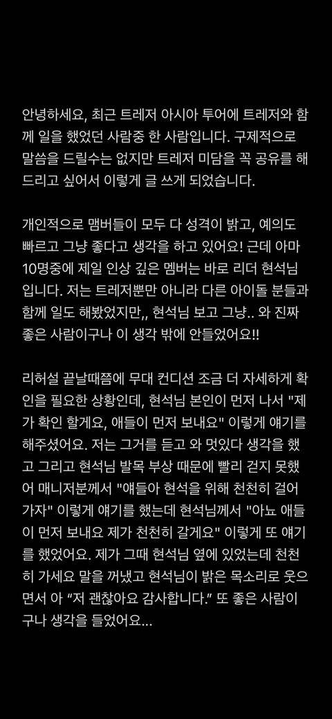 얘네 다 초딩~중딩 때부터 연습생 했어서 그런지 회사에서 교육 빡세게 시킨걸로 알고있는데 무대 뒤에서도 예의바른가봐 트레저 활동 많이 했으면 좋겠다 +통역사래 외국인인거같음