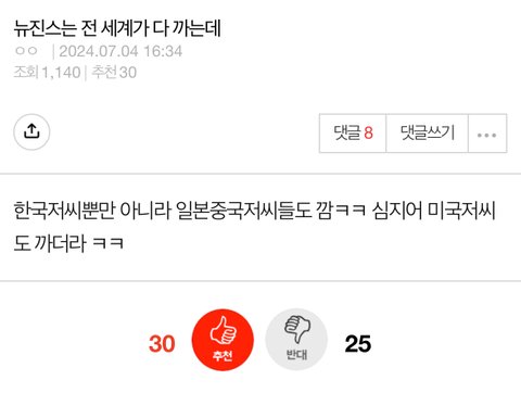 요즘 누가봐도 몰려온티나는 개저씨들이 똑같은 시간에 똑같은 내용으로 뉴진스 까글 도배하고 가는거 다들 느끼지?