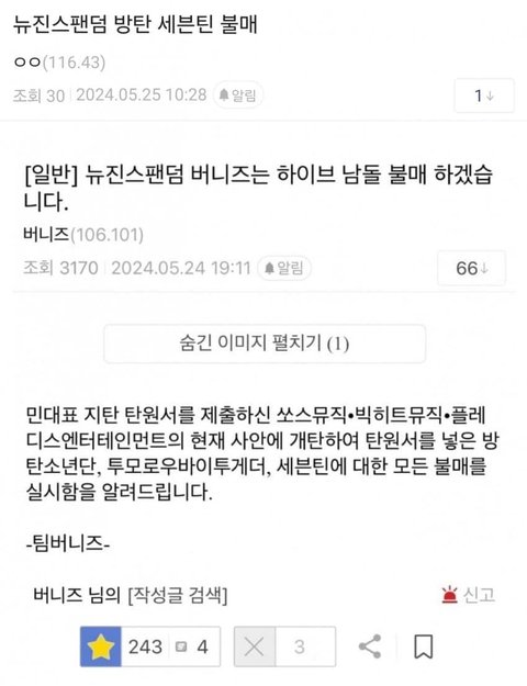 버니즈 BTS 세븐틴 투바투 불매 선언