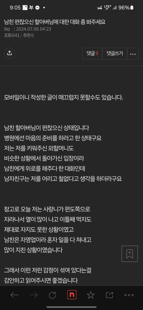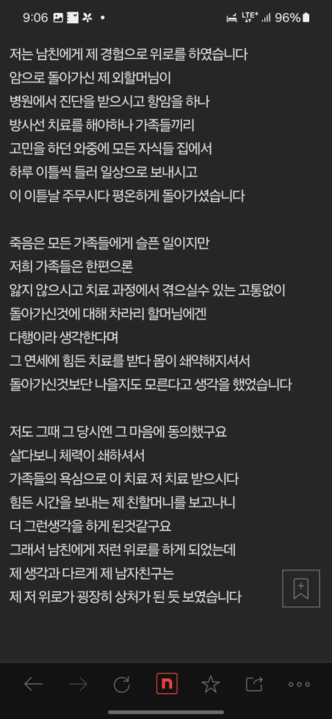 여자분의 의도도 어떤말인지 이해는됩니다만.. 내가 내 가족구성원들에대한 생각과 마음이 남들과 동일하진않죠 나에게 할아버지에대한 경험과 기억이,상대와 같지 않을수도 있으니 보편적으로 판단해 얘기하면안되는거처럼.. 일단 남자친구쪽은 병원의 얘기가어떠하든 일단은 살아계이는분이니 할아버지가 쾌차하길,괜찮아지길 바라는 방향만 바라보고있을텐데.. 여자가 죽음에대한 얘기를 하니 마음이 좋진않았을거같아요. 잠자듯 편안하게 죽는거..좋은일이라는거 모르는사람은 없겠지만 미리 앞서서, 초 치듯이 먼저 얘기할만한 가치가 있었을까 싶어요 아직 살아숨쉬는데 내가족의 죽음에관한 얘기를 굳이 듣고싶어할만한 사람이있을까요.. 마음의 준비를 하라고해도 희망,기적이 있기를 바라는 맘이 더 클테고.. 가족의 입장에선.. 설령 환자가 힘들더라도 살아있는것만으로도..존재하는것만이라도..그것만이라도 붙들고싶은 맘도 있을테니..