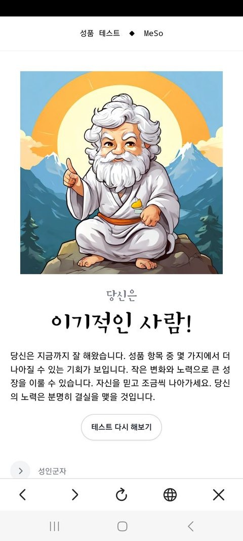 테스트 결과가 맘에 안들어. 하지만 솔까 정직하게 답변하면 다 비슷비슷하게 나올거 같은데. 대놓고 답변 고르면 결과는 만점 나오겠지. 양심적으로 자기행동 골라서 이정도면 양호한거 아냐???