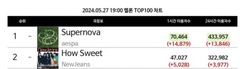 뉴진스 컴백때 50분동안 말도 안되는 추이 보여줘서 아주 잘하면 그 다음주 토,일 중 따겠다 싶었는데 5.27 아마겟돈 버프로 수노는 하늘위에 우주가 되어서 그 누구도 못 따는 노래가 되었음 그때 수퍼노바 47만 하우스윗 34만이라 용써도 불가였음