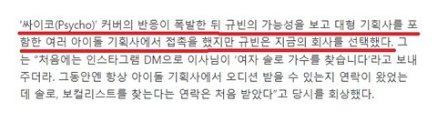 유튜브에 올렸던 레드벨벳 싸이코 커버 영상이 뜨면서 대형 기획사 포함해서 지금 회사까지 연락 엄청 받았다고