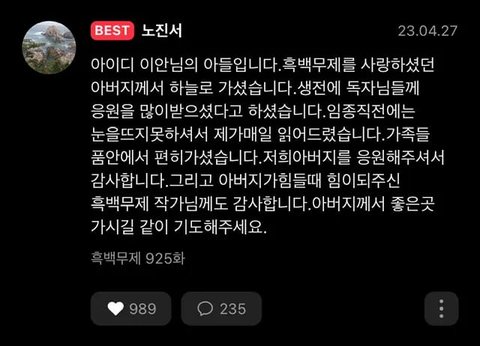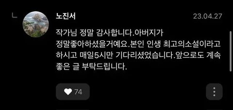 대장암 말기면 많이 고통스러웟을건데 그래도 뭔가를 보면서 하루에 낙이 있었다면 그것만큼 좋은일도 없을 듯....