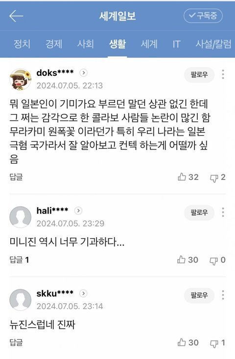 솔직히 맞말 아님..? 버니즈들이 릇릿한테 친일 염불 떨지만 않았으면 기미가요 부른 가수 노래 커버한 거? 그냥 일본 콘서트에서 팬서비스로 일본 노래 커버한 거인데 뭐가 문제냐고 할 수 있고 그게 맞지.. 근데 릇릿한테 친일그룹이라고 프레임 씌우고 창조까질 한 거 버니즈가 맞기도 하잖아; 부정할 생각 하지 마셈 유튜브 쇼츠 보다보면 릇릿 영상 뜨는데 거기 댓글 보면 친일, 표절이라면서 까는 댓글 많고 대부분 뉴진스 인장에다가 댓글 목록 보면 진짜 버니즈 많았음 유튜브 뿐만 아니라 틱톡이나 릴스도 똑같음.. 상식적으로 보면 기사까지 나고 까일 일 아닌 거 맞지ㅋㅋ 근데 버니즈들이 릇릿 상대로 패악질 일삼으면서 쓰던 논리를 적용하자면 기미가요 부른 가수의 히트곡을 불러? 그럼 친일인 게 되는 거임ㅋㅋ..