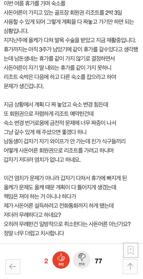 에...? 댓글들 왜 이래 나만 의견 다른가? 피크에 다륻 숙소 잡기가 얼마나 힘든데. 저런 상황이면 남동생네나 사돈측에서 저희 걱정은 마시고 형님네라도 재밌게 놀고 오세요~ 빠져서 죄송해요. 하는게 매너 아니야? 회원권이 닳는 것도 아니고 굳이 왜 빼야 하는데? 황당하네.