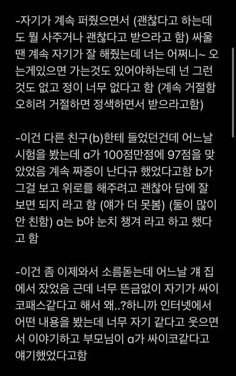 정상적이면 원래는 절교하는게 맞는건데 걔가 절교하는건 안된다고 함(아마 그 당시 친구가 A와 나 말고는 없어서 그랬던듯)큰 잘못(거짓말 한 것)