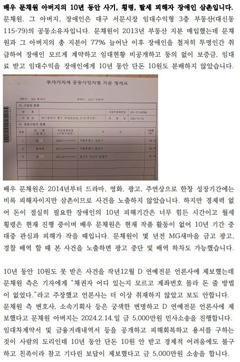 타인에게 무상임대하고 고시원가격으로 임대하고 공동소유자 3명은 10년 동안수입으로 재산세도 못 내고 장애인 친족에게는 10년 동안 10원도 안 준 것이 문채원 측의 세무신고 기록이고 장애인 친족에게 2024.2 통보한 내용입니다.