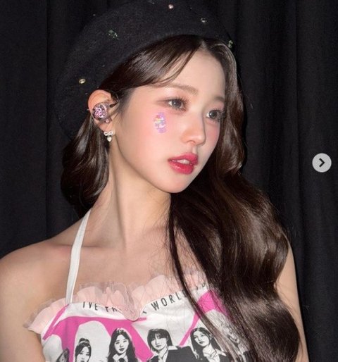사진 속 장원영은 아이브가 그려진 상의를 입고 베레모를 써 유니크한 룩을 보여준다. 장원영은 빛나는 메이크업으로 포인트를 줬다.