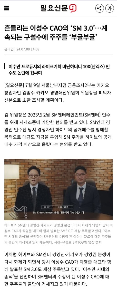 흔들리는 이성수 CAO의 ‘SM 3.0’…계속되는 구설수에 주주들 ‘부글부글’