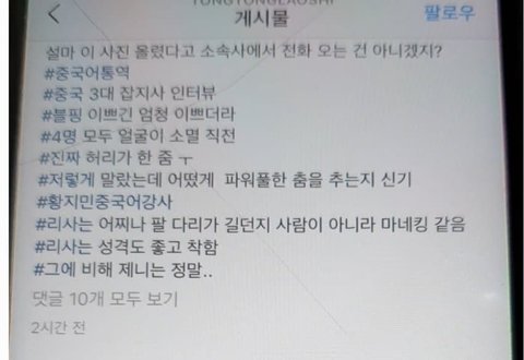 제니팬들 첫번째짤 뜨고 리사 ㅈㄴ 괴롭힌거 아냐? 통역사가 리사팬이라 일부러 제니 흠집내려고 글 올렸다고ㅋㅋㅋㅋㅋㅋ언젠 한국인들 리사한테 관심 없고 팬더 없다면서 이럴땐 모두가 리사팬이라고 하는 그분들ㅋㅋㅋ이지만 리사 생각해서라도 걍 글삭하셈 또 리사 쳐 패러 몰려옴