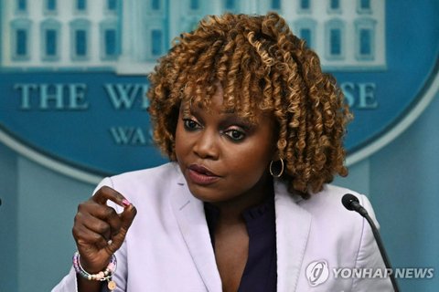 (워싱턴DC=AFP) 8일(현지시간) 미국 워싱턴DC 백악관 브리핑룸에서 언론 브리핑 중인 카린 장-피에르 백악관 대변인. 2024.7.9 photo@yna.co.kr
