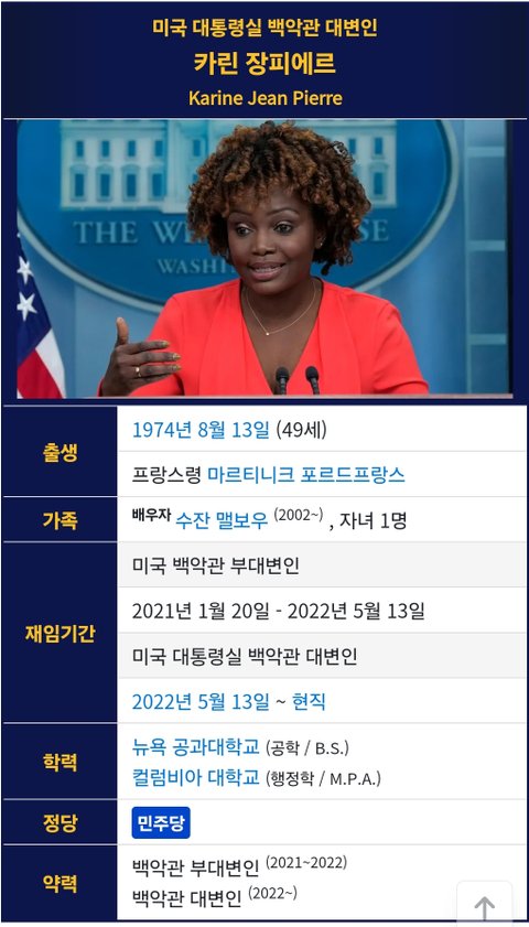 (사진3 설명) 카린 장-피에르(Karine Jean Pierre) 미국 대통령실 백악관(대변인) <출처 : NAVER 나무위키>