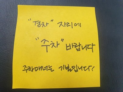 제 차는 모닝이고, 현재 주차하는 곳은 지하 6층까지 주차장입니다.제가 주차하는 곳은 지하 2층 이고, 주차 공간이 부족한 곳도 아닙니다.(회사가 건물 안 에 있어서 월정액으로 주차비도 납부하면서 주차하고 있습니다.)가끔 출근 시간이 늦어서 일반 주차 자리가 많지 않을 때는 다른 분들 주차하시라고 비어있는 경차 구역에 주차합니다.그런데, 경차 구역에 주차해보신 분들은 아시겠지만 자리가 좁기도 하고 특히 벽쪽으로 경차 구역 만들어둔 곳은 문을 열고 내리기 힘들어요.그래서 차라리 출근 시간을 좀 일찍 해서 주차하자 싶어 요즘은 20분 정도 일찍 도착해요.덕분에 주차 자리가 많이 있어 일반 구역에 주차하고 있었고요.그런데 어제 퇴근하려고 주차장에 갔는데 저런 쪽지가 붙어 있더라고요.