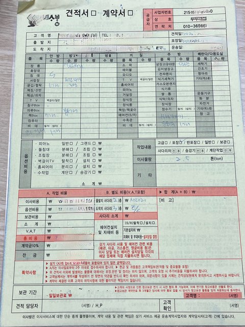당일 사다리차 없이 인원 1명 추가로 변경 하셨고