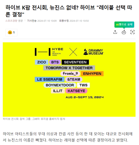 그래미 뮤지엄서 하이브 아티스트 전시회…뉴진스는 빠져