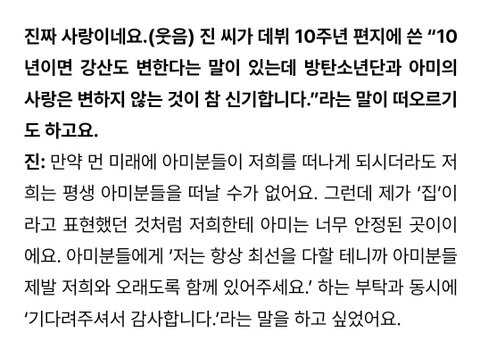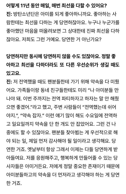 진짜 방탄은 원탑으로서 전성기 오래가는데에 이유가 있다고 생각하게 됨 다른 멤버들도 그렇지만 특히 진에 대해서 생각해 보면 각 멤버에 맞춰주는 물같은 사람같다가도 올곧은 면모를 보면 심지가 단단한 사람같고 그래