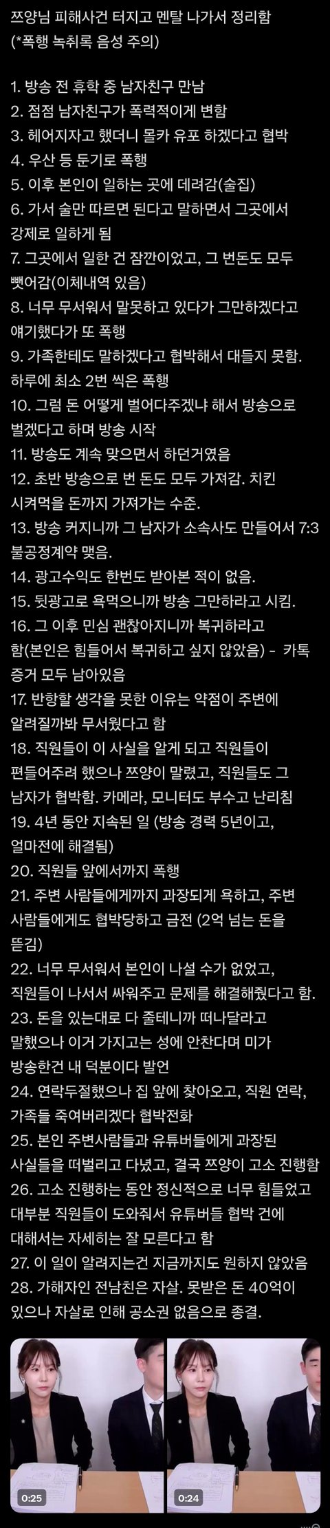 쯔양이 공개한 영상보면 전남친한테 폭행당하는 소리가 PTSD 생길정도로 적나라하게 나옴
