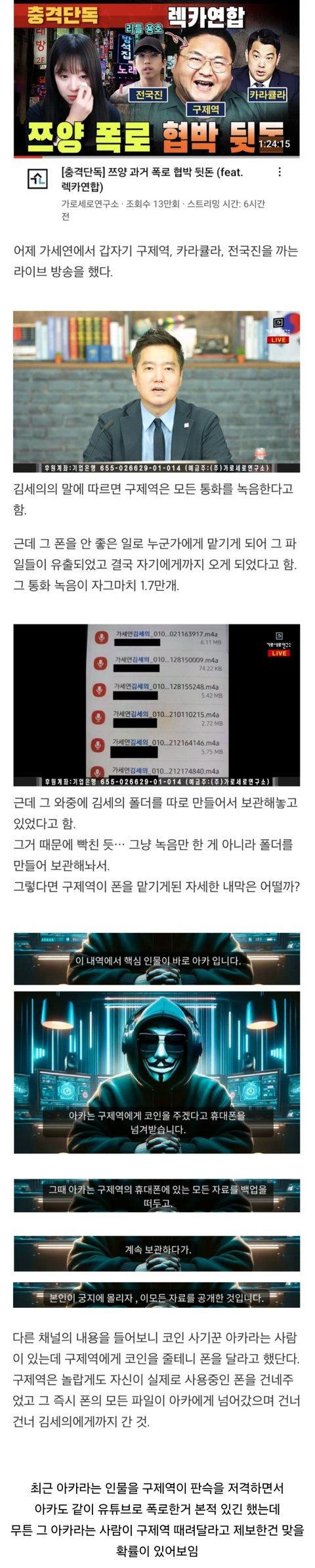 가세연도 폴더를 만들어 통화녹음을 저장한거 보고 개빡돌아서 폭로. 여기서 렉카들간의 담합과 쯔양이 뜯긴게 알려짐