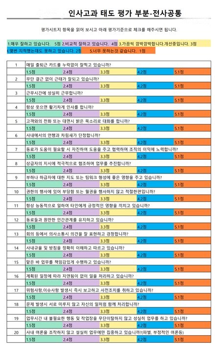 우리는 태도가 바르지 못하거나 저기 위에 보이는 것처럼 점수가 낮으면 불이익을 주고 연차도 강제 연차고.. 내 연차 쓰는데 연차를 쓰면 월급이 깎여.. 힘들다 그냥 다 ㅠㅠ