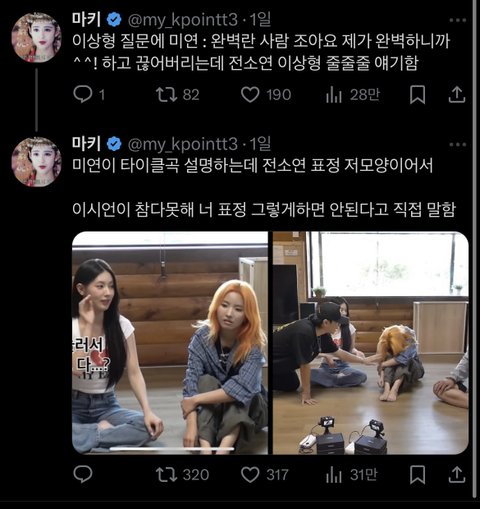 마키 쟤 수진 학폭 터졌을때는 수진 올려치기하고 슈화팬들이 슈화 파트 적다고 소연이 탈퇴총공 했을때는 슈화팬들 편 들어주던애임ㅋㅋㅋㅋ그와중에 아무것도 안한 소연이는 계속 싫어했고;; 그 시절 부터 지금까지 그냥 소연이 싫어해서 까는앤데 이간질을 뭐 이렇게 시키냐ㅋㅋㅋ 니들 소연이 팬도 아니고 다른멤버 팬도 아닌거 엄청 티 나 그만좀 해