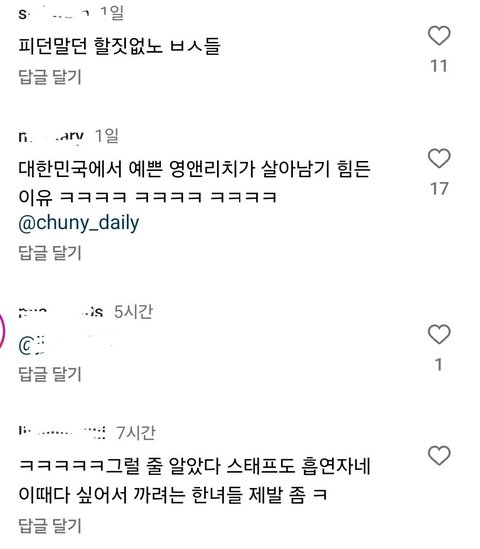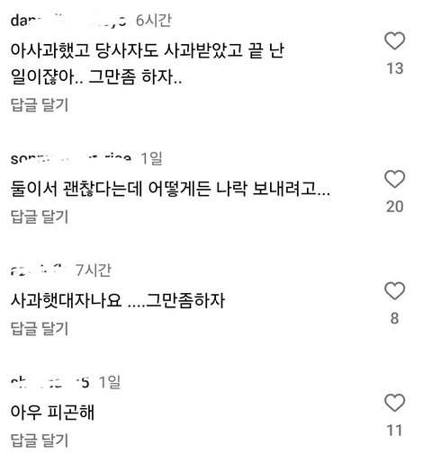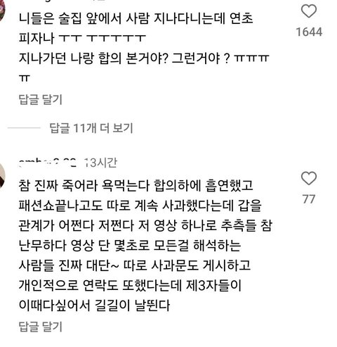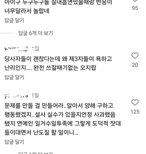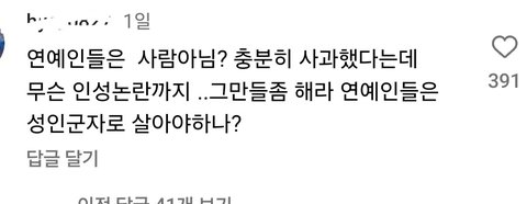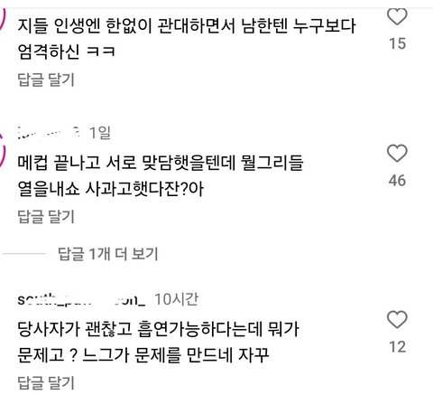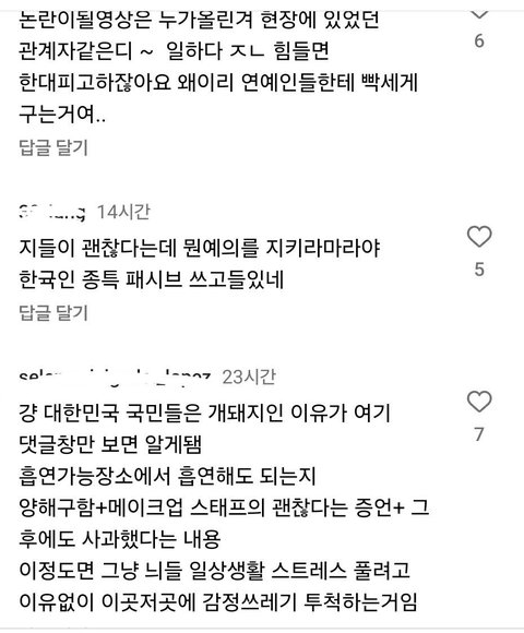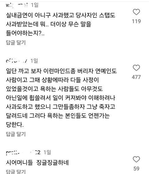 쉴드 많이 받는 구만ㅋㅋㅋㅋㅋ 밑에 비판하는 댓글이나 이때싶 억까하는 댓도 있긴한디 구라댓글 믿고 억쉴 치고 걍 그 행동 자체를 쉴드치는 빠순이빠돌이들+대중들 생각보다 많음 당장 저 한 게시물만 봐도 쉴드 치는 댓이 좋아요 젤 많은걸??? 인기 비례하는 다른 연옌이었으면(남돌여돌 상관없이) 쉴드 저 정도까지는 안 칠텐데... 뭔 사과했으니 됐다는 식이지 저건 걍 개념 문젠데... 게다가 한낱 정병이라고 해도 방탄 머리채도 잡던데 왜 그러누ㅠ 여태껏 실내흡연 했던 남돌들도 이 정도로 쉴드는 안 받았다ㅜ