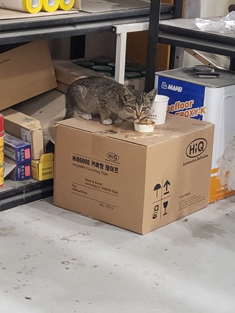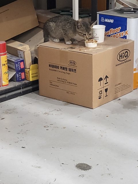 송파 물류센터쪽인데 며칠전 비가 쏟아지던날에 아기고양이가 혼자들어와서 자리잡았대요
