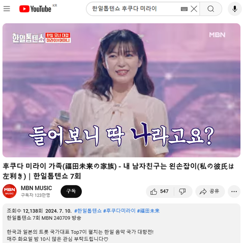 (사진3 설명) 후쿠다 미라이 가족(福田未来の家族) - 내 남자친구는 왼손잡이(私の彼氏は左利き)|한일톱텐쇼 7회 YouTube MBN 동영상 화면 캡춰