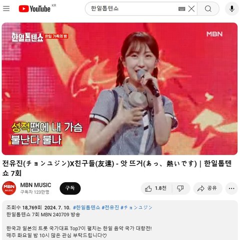 (사진4~5 설명) 전유진(チョンユジン)X친구들(友達) - 앗 뜨거(あっ、熱いです)|한일톱텐쇼 7회 YouTube MBN 동영상 화면 캡춰