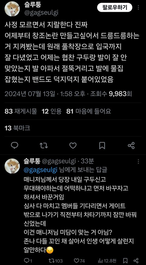 해명글 보고도 까는애들은 반대로 슬기가 저거 구두 계속 신어서 발 망가져서 담날 공연 망치면 슬기 발 저지경되도록 놔뒀냐며 매니저 깔거 같음.