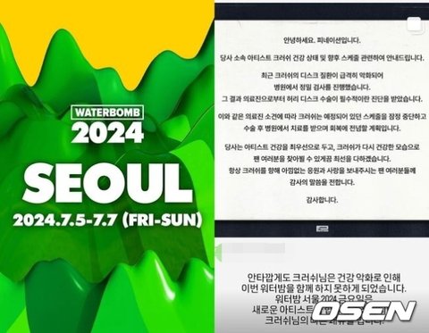 크러쉬 측의 공지가 올라온 뒤 ‘워터밤 서울 2024’ 측은 SNS를 통해 크러쉬의 공연 불참을 알렸다. 워터밤 측은 “안타깝게도 크러쉬 님은 건강 악화로 인해 이번 워터밤을 함께 하지 못하게 됐다. 워터밤 서울 2024 금요일은 새로운 아티스트가 합류할 예정이다”라고 밝혔다.